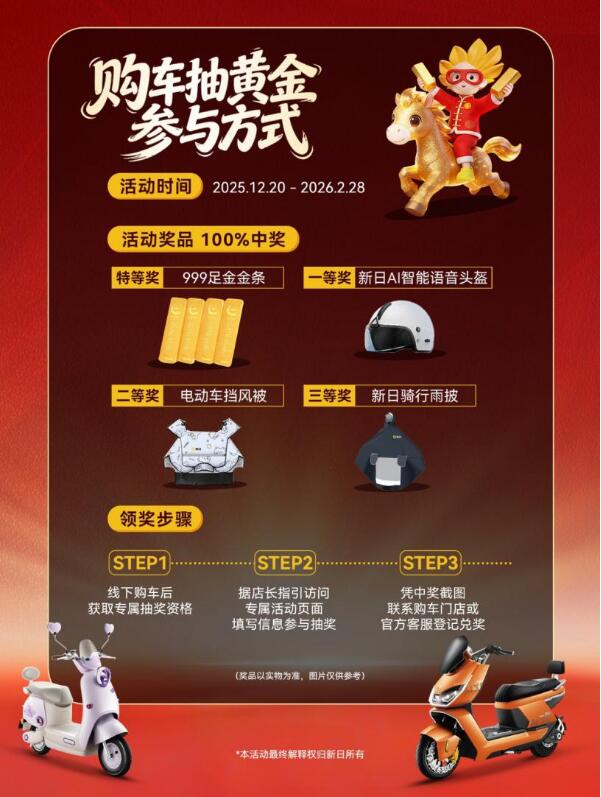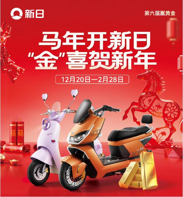 春运的钟声已经敲响,每一颗盼归的心,都装载着对团圆的渴望、对轻松的向往,还有一份对新年好运的期待。这个春节,新日电动车以“马年开新日,金喜贺新年”为主题,为返乡人备下一份既实用又有彩头的“出行好礼”——购车即有机会抽取10g999足金金条,还可享受抖音专享券、全国统一爆款价等多重优惠,让回家的路更轻松,让新年的开端更有惊喜。